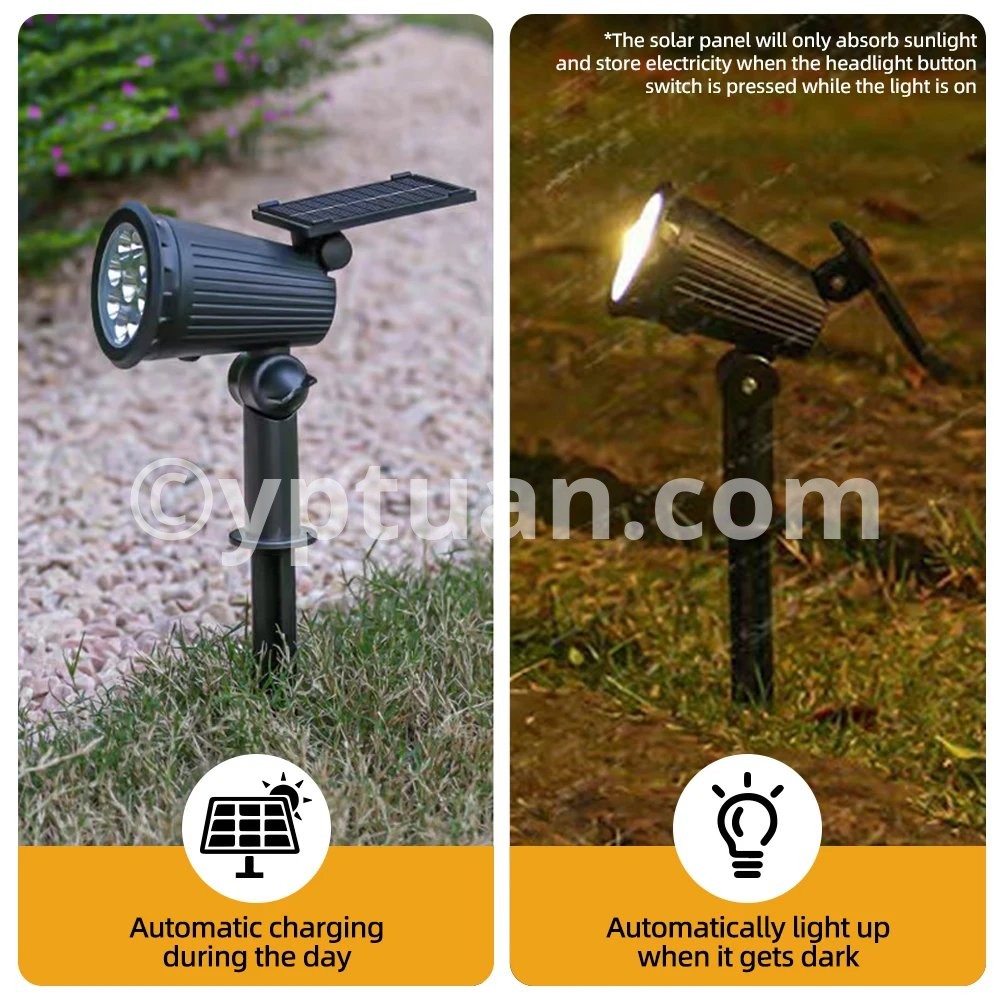 When using it for the first time, it is necessary to press and hold the "ON" button in sufficient sunlight to turn on the light for charging. Please note that when the light is turned of, it will not continue charging!Please note that solar energy can only be lit in dark environments. During the day,you can place the solar panel facing down on the table to ensure that the panel can not see light, the lights are lit, and it can be charged when placed in sunlight.