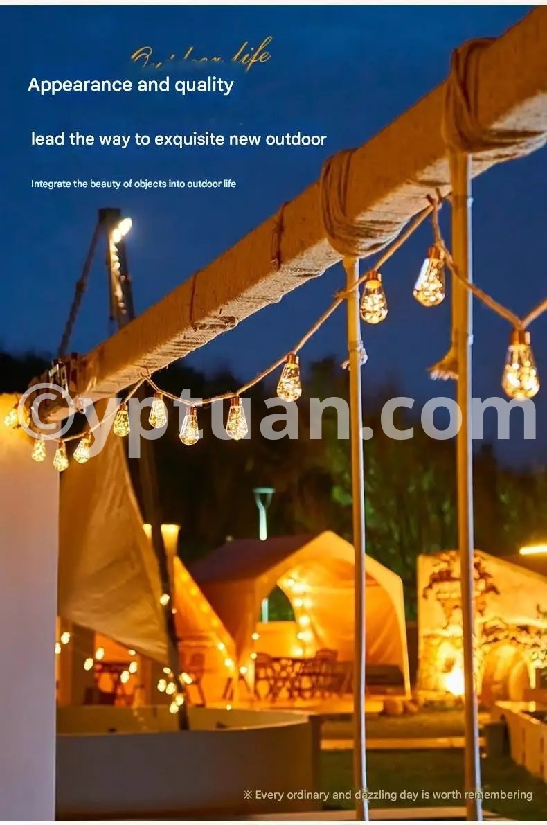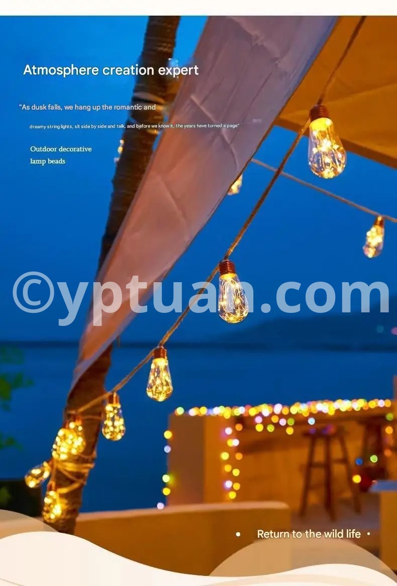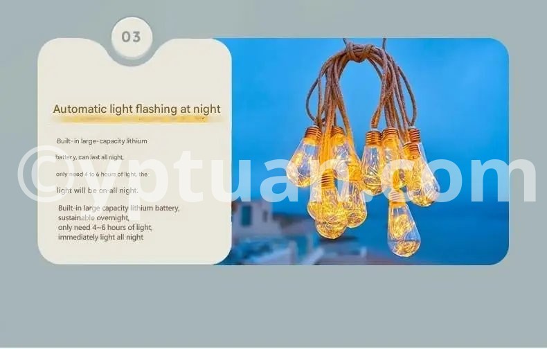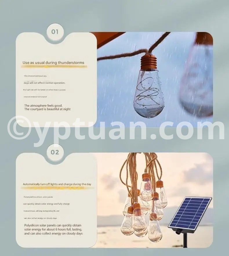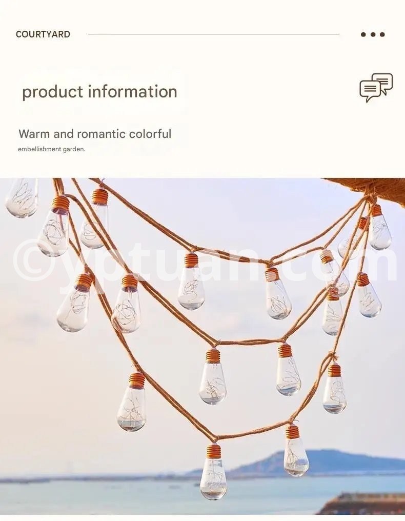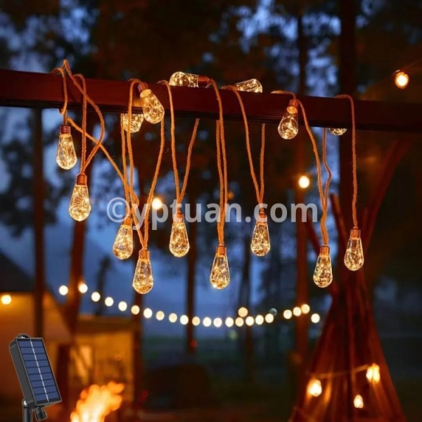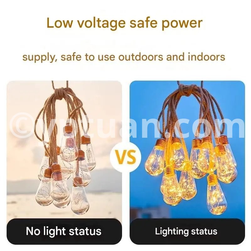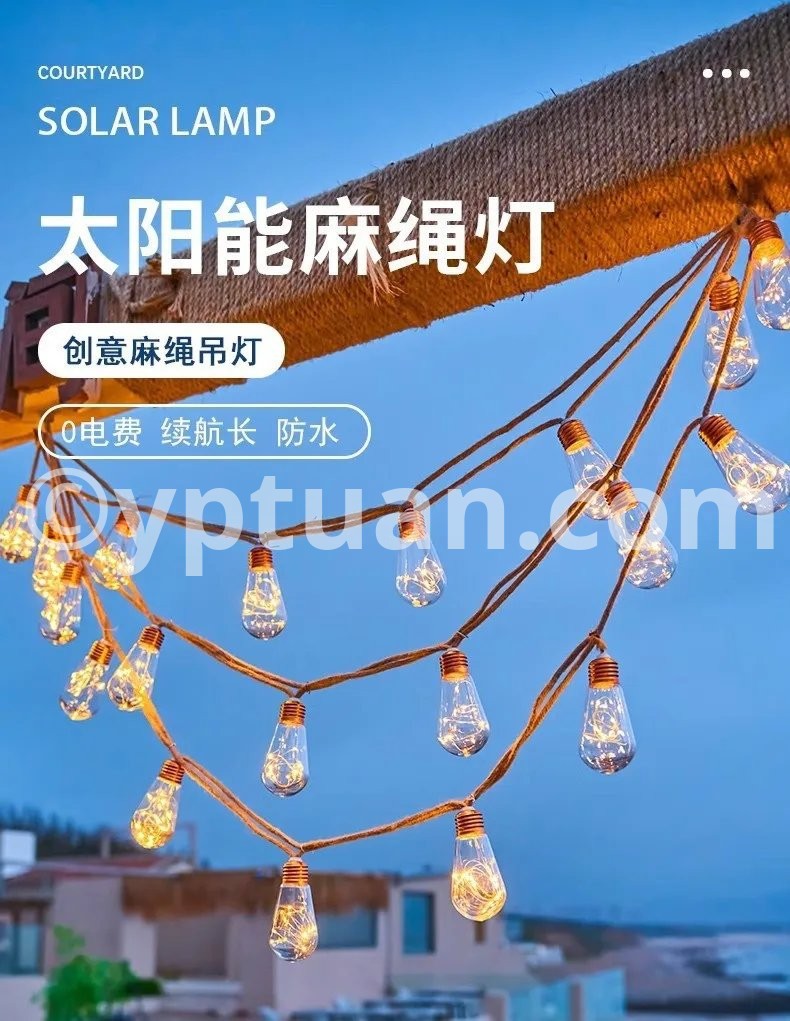 Vintage-style solar lights outdoor: This vintage-style solar string light is made of high-quality natural hemp rope and tough plastic bulbs. It can be hung on the dining table, woven into the beams of the pergola, or hung from the balcony railing to create a special vintage bistro look and cozy party atmosphere. 7M hanging string lights with 16 bulbs, light length 10cm. Each bulb includes 6 LEDs, a total of 96 LEDs. Solar powered outdoor lights & Auto On/Off: This outdoor string lights are solar powered and energy saving, with no extra utility electric cost and no need to replace the battery. The light sensor controls the solar patio lights charging under sunlight and will autolight up at dask or in darkness, just turn on the switch and put it under the sunlight. It will takes 6-8 H to have it fully charged. 8 Modes Setting & Memory Function: The solar string lights for outside have an On/Off button and a Mode button, press the mode button to select 8 different modes to satisfy your diverse needs. The outdoor solar lights have memory function which could remember the previous setting mode when you restart. Different modes will provide different moods for you and no need to reset mode every day. IP65 Waterproof & Shatterproof: The led solar string lights are suitable for indoor & outdoor. Fully weatherproof, no matter what weather, it still gives soft, romantic light. The outdoor bulbs string lights are made of tough and shatterproof plastic. More shatterproof and safe to use. Wide Application: The vintage rope hemp solar garden lights can create a cozy and romantic atmosphere. Suitable for decorating your patio, porch, gazebo, railing, balcony, living room, restaurant, hallway, loft, bar, bistro, cafe, etc.Also suitable for birthdays, wedding parties, Valentine's Day, Halloween, Christmas and other holiday decorations