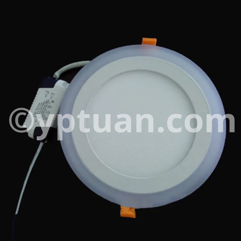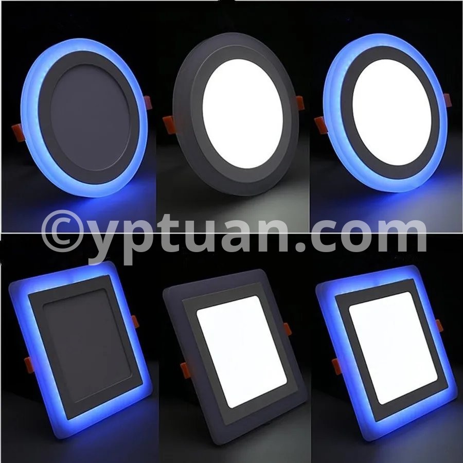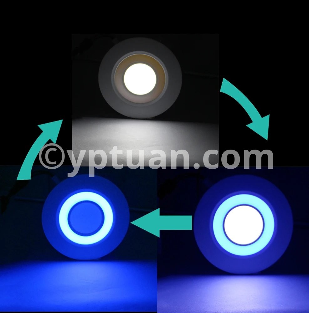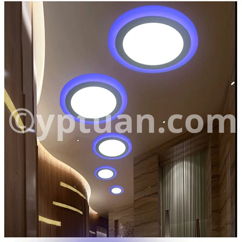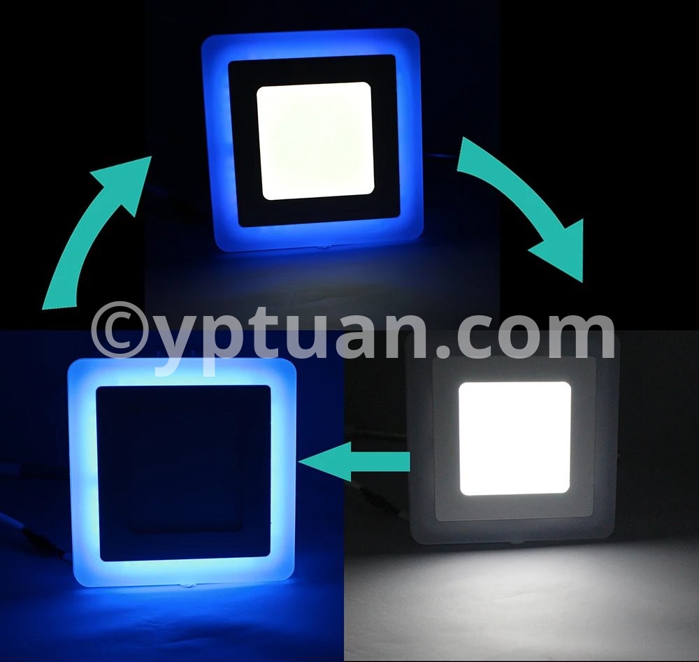 Working Model Could be Changed via Normal ON-Off Switch Three model control: Switch 1: Light Blue of the ring Only; Switch 2: Light Cold White( Warm White) of the center only; Switch 3: Light Both of the Blue and the Cold White (Warm White). Specification Type: LED panel down light Power:6w 9w 16w 24w Shell Color: white Shell Material: Aluminium + Acrylic cover Working temperature: -20 -65 ° C Life Time:> 50,000H Warranty: 3 years Beam angle: 180 degree Dimmable :Yes(3 color) input voltage: AC85-265V 50 / 60HZ LED Chip: Super Bright SMD2835 Color Temperature: Warm White (3000-3500K) / Cold White (6000-6500K) + Blue Color Rendering Index :(CRI)> 80 Certificate :CE, RoHS Wide Application: Commercial and exhibition locations Hotel, conference room Factory, office, house Airport, metro, station School, hospital and other public places Places that require energy-efficient and high color rendering index Package Included: 1 X LED Panel Light 1 X Driver