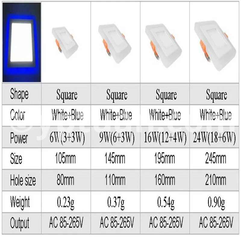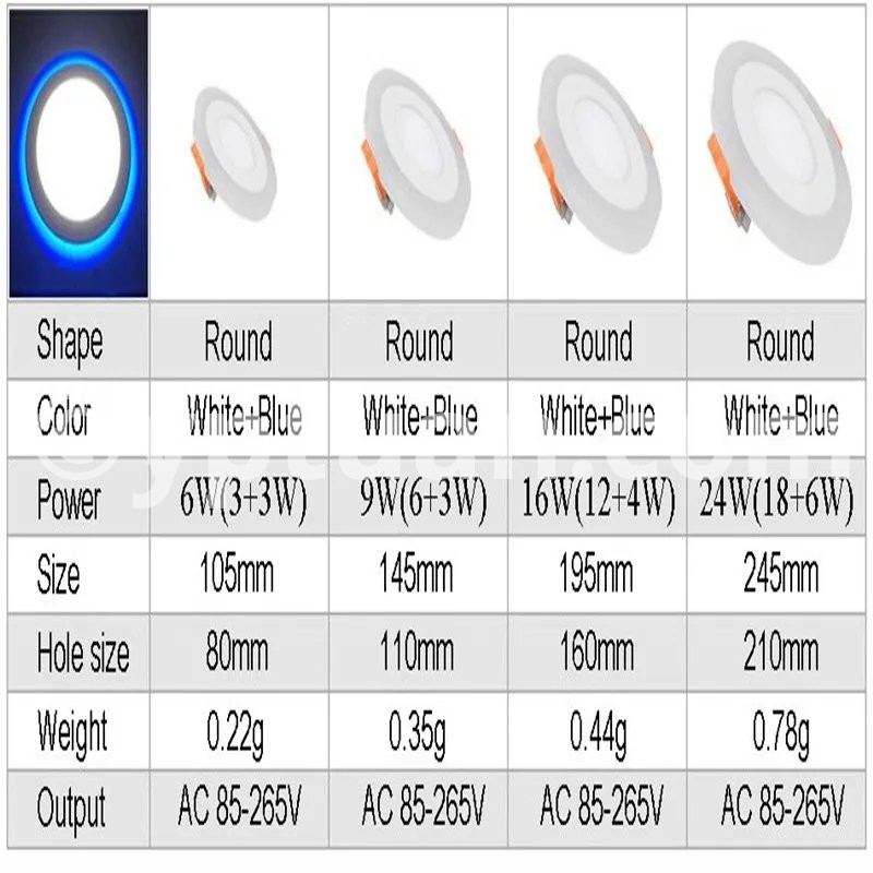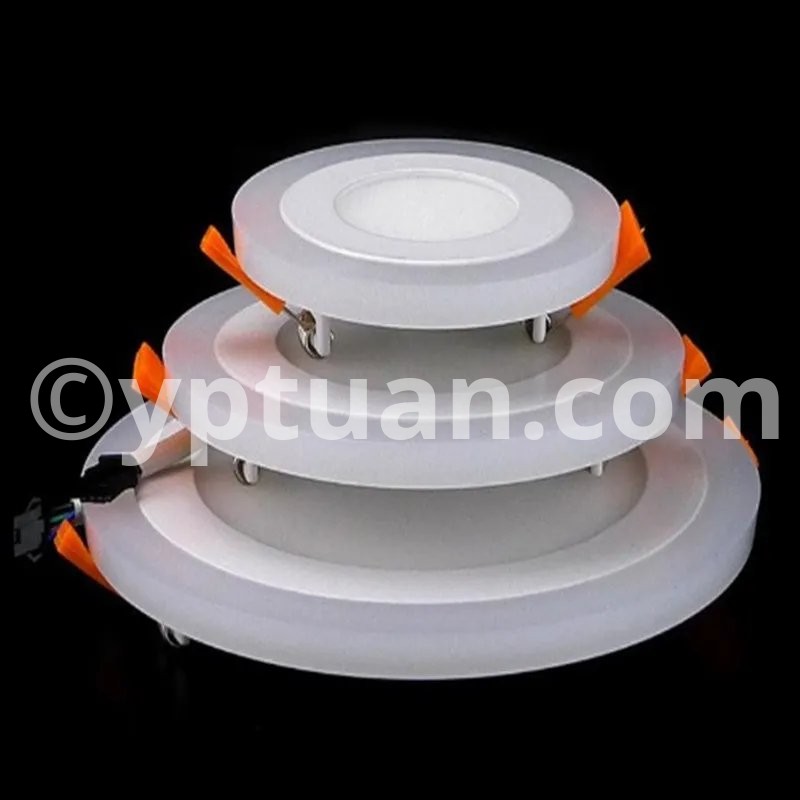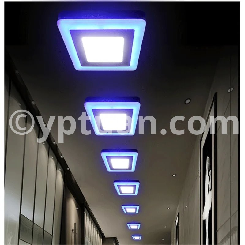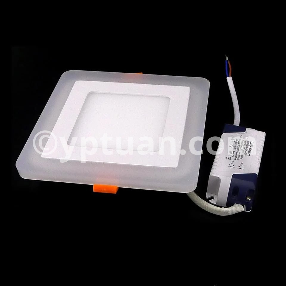 Working Model Could be Changed via Normal ON-Off Switch Three model control: Switch 1: Light Blue of the ring Only; Switch 2: Light Cold White( Warm White) of the center only; Switch 3: Light Both of the Blue and the Cold White (Warm White). Specification Type: LED panel down light Power:6w 9w 16w 24w Shell Color: white Shell Material: Aluminium + Acrylic cover Working temperature: -20 -65 ° C Life Time:> 50,000H Warranty: 3 years Beam angle: 180 degree Dimmable :Yes(3 color) input voltage: AC85-265V 50 / 60HZ LED Chip: Super Bright SMD2835 Color Temperature: Warm White (3000-3500K) / Cold White (6000-6500K) + Blue Color Rendering Index :(CRI)> 80 Certificate :CE, RoHS Wide Application: Commercial and exhibition locations Hotel, conference room Factory, office, house Airport, metro, station School, hospital and other public places Places that require energy-efficient and high color rendering index Package Included: 1 X LED Panel Light 1 X Driver