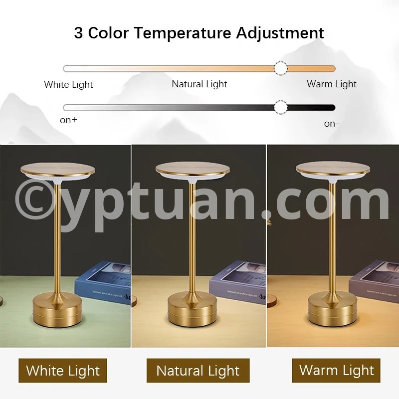 Finish spray: plating Light color:Tricolor dimming Light Source:LED (included) Power Supply: Lithium Battery(4000mAh) Switch type:Touch switch Design Style:Modern Charging Time:4-6 hours Working Time (hours):8-10 hours