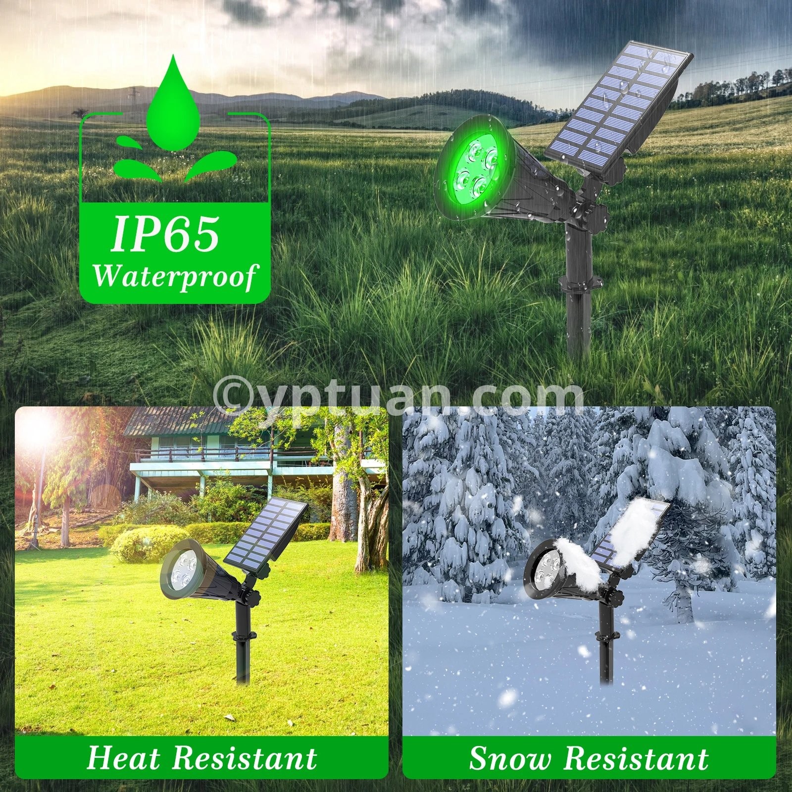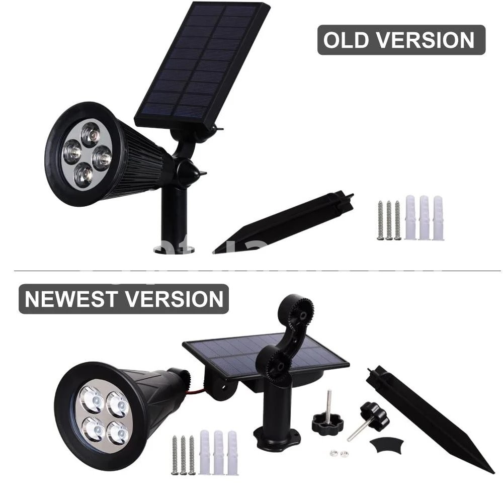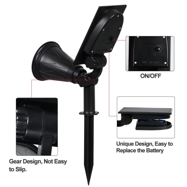 Upgraded Solar Outdoor Spotlights: Waterproof (IP65), Heatproof and Super Bright - 200 Lumen output, 4 x 50 Lumen enhanced LED Long Working Time - Built-in 18650 lithium rechargeable battery(2200mAh). Light up 8-14 hours after fully charged.About 5-6 hours full charge It has easy ground-installing or wall-mounting facility. All screws are provided; tools and wiring are not needed. rugged and durable. Fully 180-degree adjustable unit enables lighting to be used exactly where needed and catch sunlight at optimum angle for charging; automated off' at day provides lighting exactly when needed. IP65 RATING: designed to withstand dust and water jets. No need to worry about rainy day or any bad weather.