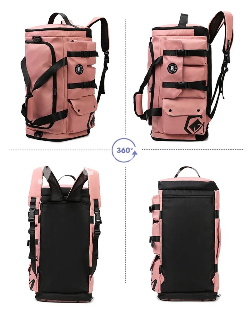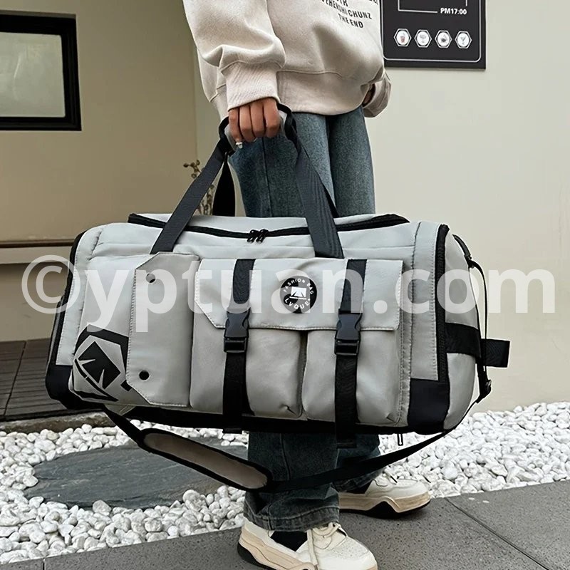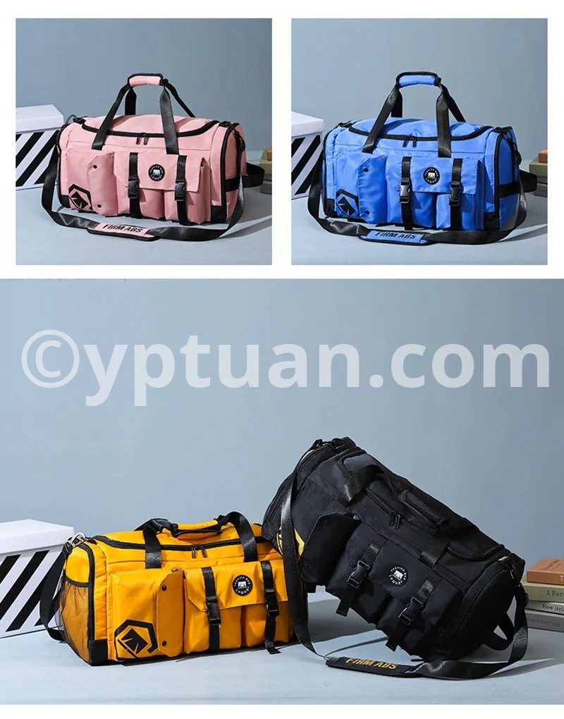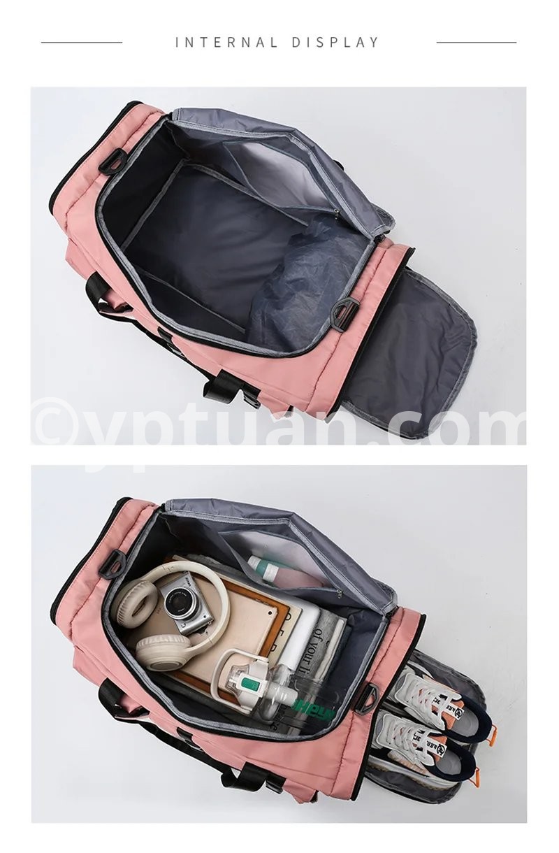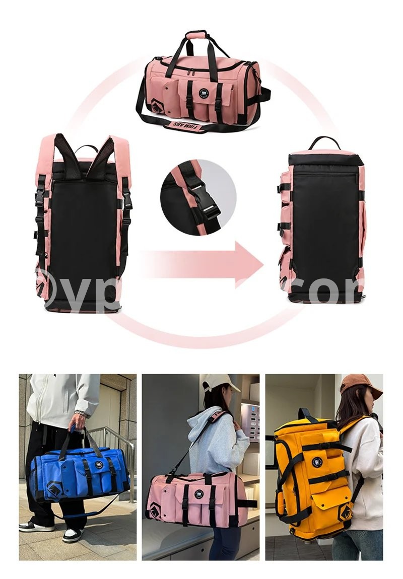 Feature: 1. indepedent shoes storage pocket for shoes storage pocket. 2. with individual dry and wet separation storage pocket to keep your bag tidy and tidy. 3. multi-pocket design for your need. 4. front and side zipper pockets on cards,key,or other small things. 5. concealed double shoulder straps. can be used as backpack to releave your hands during the traveling. 6. trolleycase sleeve can be use together with trolleey case . it's portable during the travel. Specifications 1. Name: quality oxford cloth large capacity camping hiking traveling weekender shoulder crossbody handbags 2. Color: yellow, grey, blue, pink, black 3. Size: height 28cm, width 26cm,length 55cm Package List: 1x Shoulder Backpack